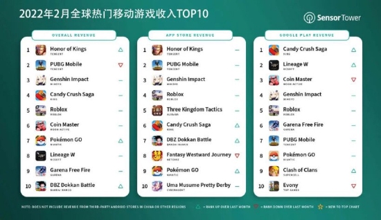 2月全球热门手游收入排行 《王者》第一《原神》第三